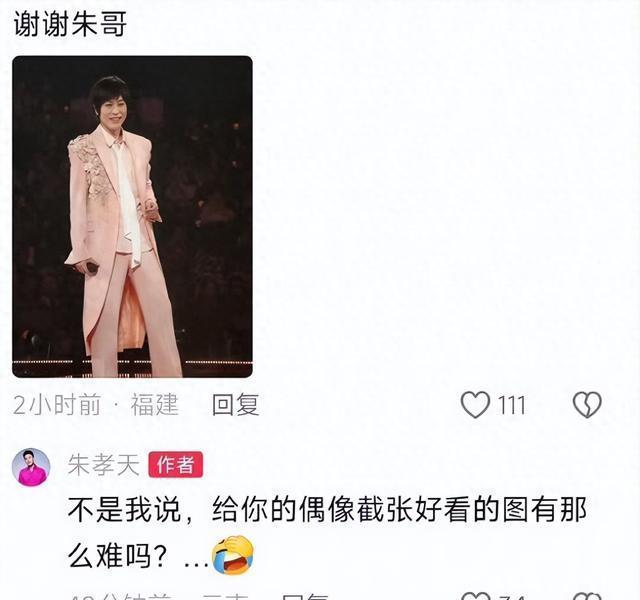 朱孝天回复 “不是我说,给你的偶像截张好看的图有那么难吗……”, 这句话被人解读为朱孝天吃不到葡萄说葡萄酸。